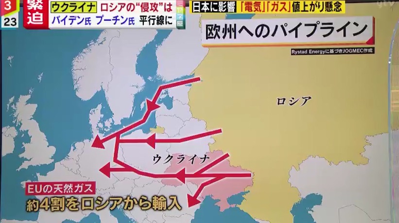 しかしNATO側も、ロシアに対して一枚岩になれない理由がある。それは、ロシアがにぎっている「天然ガス」だ。EUは、天然ガスの約4割をロシアからの輸入に頼っているため、仮にロシアからの供給が止まると、世界的な天然ガスの価格高騰に拍車がかかると言われている。