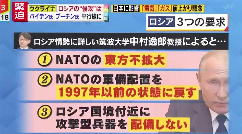 ウクライナをNATO加盟に加盟させるなというロシアの要求をアメリカは拒否、アメリカの「お互いの軍事演習を制限しよう」という提案にロシアは回答せず、外相会談も具体的な進展が見られないという状況になっている中、プーチン大統領は「ロシアの懸念が無視されている、今日NATOはどこにいる?言っていることとやっていることが違う、だまされた」と述べた。