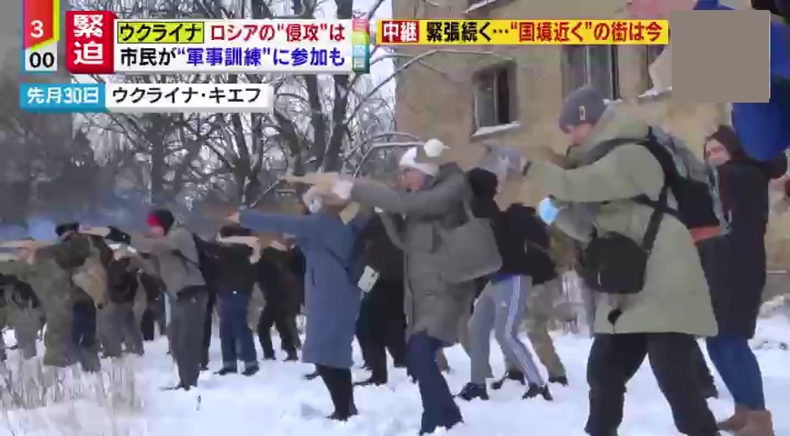 緊張が高まるウクライナ国内では、一見通常の生活が営まれているように見えるが、ロシアの軍事侵攻への備えも着実に進んでいる。キエフ市では、最大320人が収容できて核攻撃にも耐えられる“防空壕”の点検を進めており、誰を避難させるかもすでに決めてあるという。また、工場跡地ではロシア軍の攻撃に備え、一般市民200人が参加する“軍事訓練”が行われ、参加者には若い女性や10代の子どもの姿もあった。ロシアが国境付近に軍を配備して以降、訓練への参加者は増えているという。