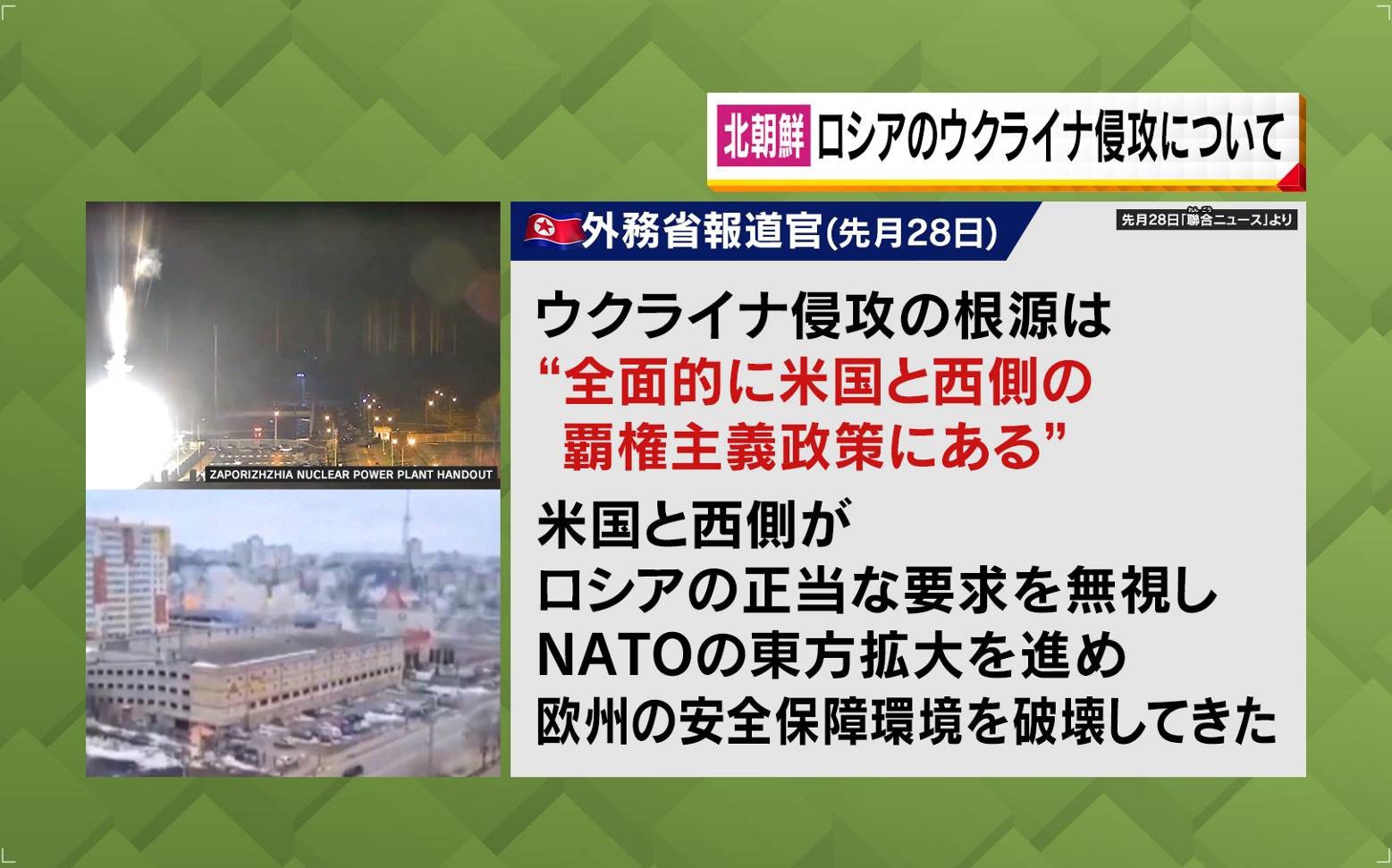 北朝鮮はロシアのウクライナ侵攻に対して「ウクライナ侵攻の根元は全面的にアメリカと西側の覇権主義政策にある」と批判しました。「アメリカと西側がロシアの正当な要求を無視し、NATOの東方拡大を進め、ヨーロッパの安全保障環境を破壊してきた」とも述べ、完全にロシア側に付いています。
