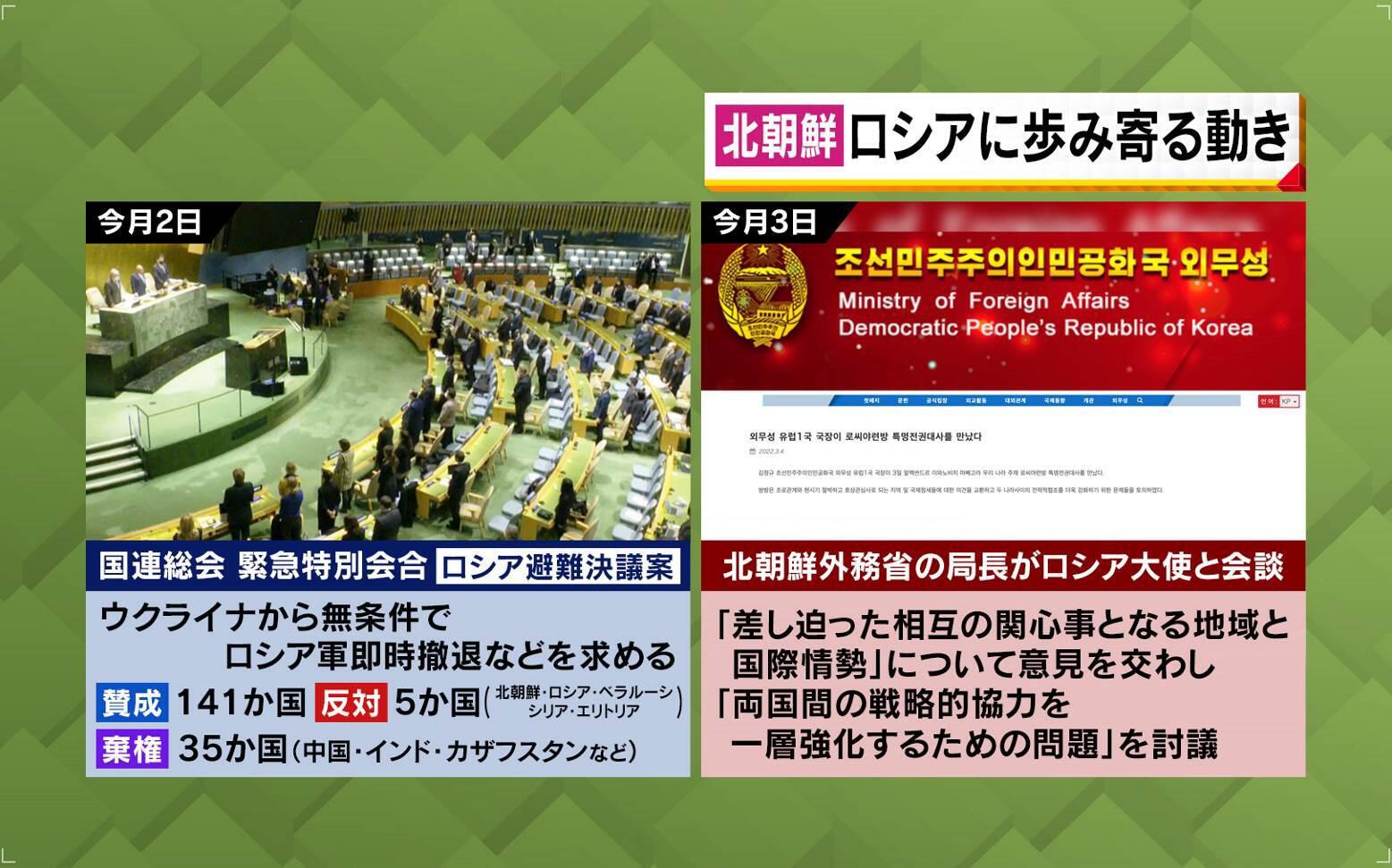 さらに、3月2日の国連緊急特別会合でロシア非難決議案が採択されましたが、ここでの反対5票に北朝鮮も入っていたということです。そしてその翌日に、北朝鮮外務省の局長がロシア大使と会談し、両国間の戦略的協力を一層強化するための問題を討議したということです。ロシアのプーチン大統領と金正恩総書記の関係も良好で、北朝鮮はロシアに近づいていますが、プーチン大統領は北朝鮮の“核保有には反対”の姿勢です。