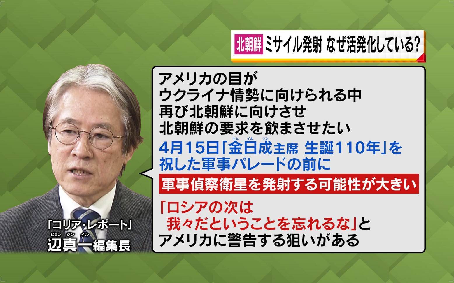 「北朝鮮は非常にわかりやすいんです。米韓軍事演習や経済制裁などの、アメリカの北朝鮮に対する敵対政策をやめない限り、北朝鮮はミサイル発射を続けていく、ということを行動で示しているのでしょう。『ロシアの次は我々だということを忘れるな』という警告の意味があると思われます」