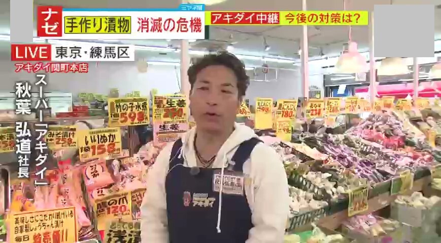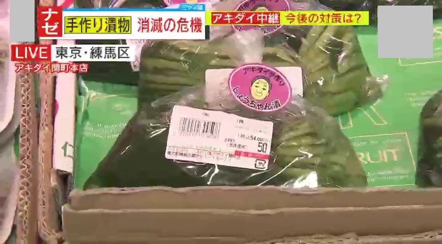 東京・練馬区のスーパー『アキダイ 関町本店』でも、自家製のぬか漬けや白菜漬けなどを製造・販売しています。しかし、厚生労働省によると、『アキダイ』のような野菜果実の販売業に関しては、塩漬け・ぬか漬けの製造販売は許可が不要だということです。ただ、この条件に含まれない漬物、例えば『なます』などは、6月以降はこれまで通りの製造・販売ができません。