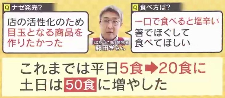 開発者・藤田さんによると、発売した理由は「店の活性化のため、目玉となる商品を作りたかった」、食べ方は「一口で食べると塩辛いので、箸でほぐして食べてほしい」といいます。
