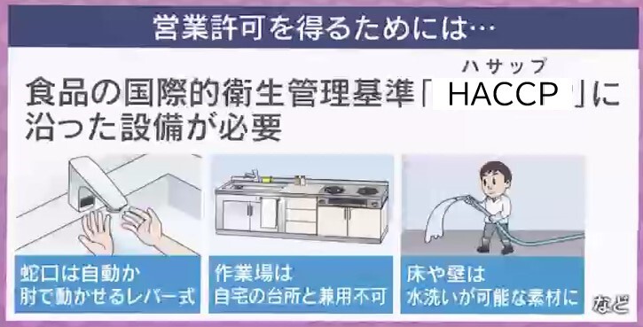 2021年に食品衛生法が改正され、2024年6月から漬物の製造・販売に営業許可が必要になります。許可を得るためには、食品の国際的な衛生管理基準「HACCP(ハサップ)」に沿った設備が必要になります。例えば、「蛇口は自動か肘で動かせるレバー式」「作業場は自宅の台所と兼用不可」「床や壁は水洗いが可能な素材に」などがあります。