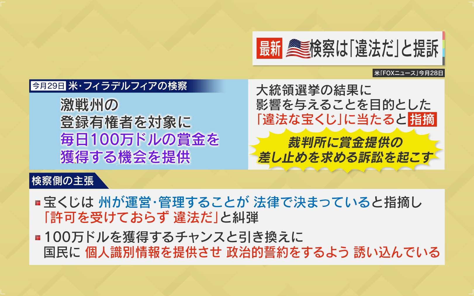 アメリカの検察は、マスク氏の行動が「大統領選の結果に影響を与えることを目的とした“違法な宝くじ”に当たる」と指摘し、裁判所に賞金提供の差し止めを求める訴訟を起こしました。