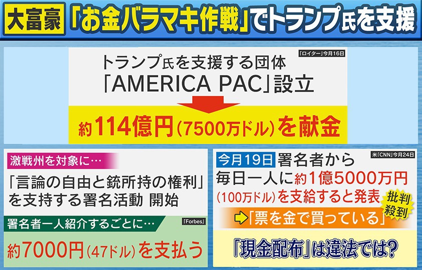 そんな中、トランプ氏支持を表明している“大富豪”イーロン・マスク氏が、「お金をばらまいている」として物議を醸しています。『ロイター』によると、マスク氏はトランプ氏を支援する団体『AMERICA PAC』を設立し、約114億円(7500万ドル)を献金しました。