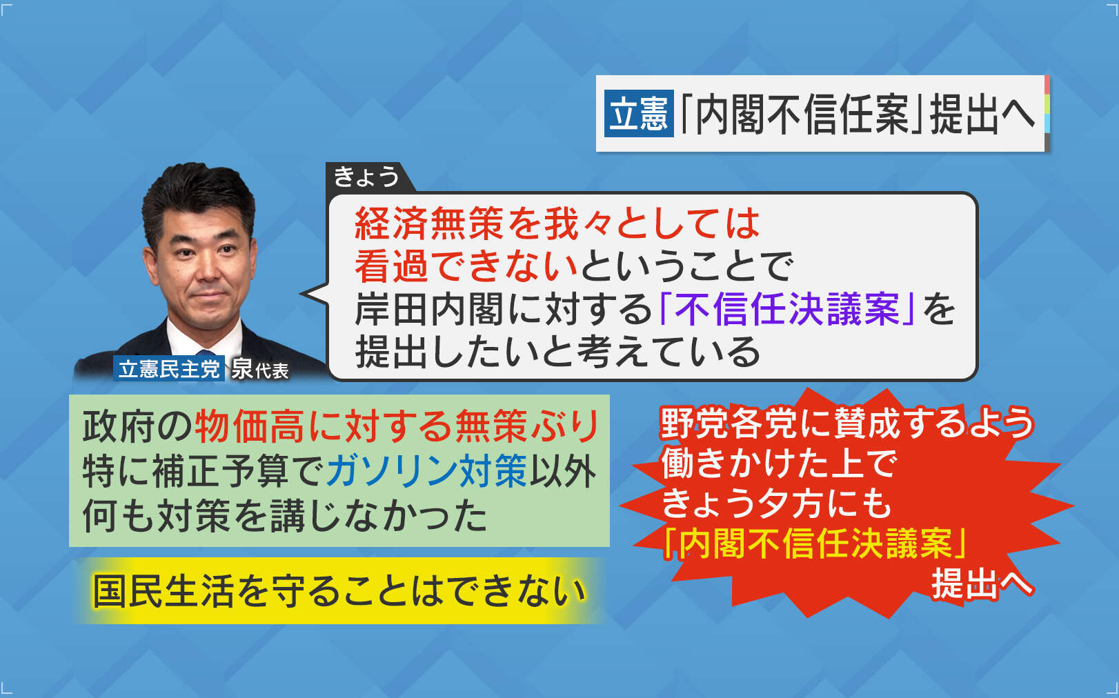 8日午後には、立憲民主党の泉代表は「経済無策を我々としては看過できない」とし、岸田内閣に対する「不信任決議案」を提出しました。政府には財政の健全化や、少子高齢化などの将来の不安への対策などを行い、本当に物価が上がることを許容できるよう、全ての人の所得を増やす施策を早急に講じることが望まれます。