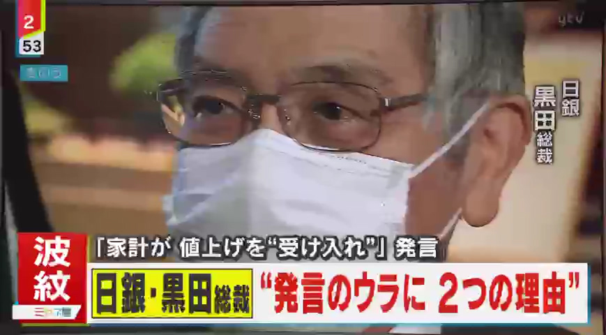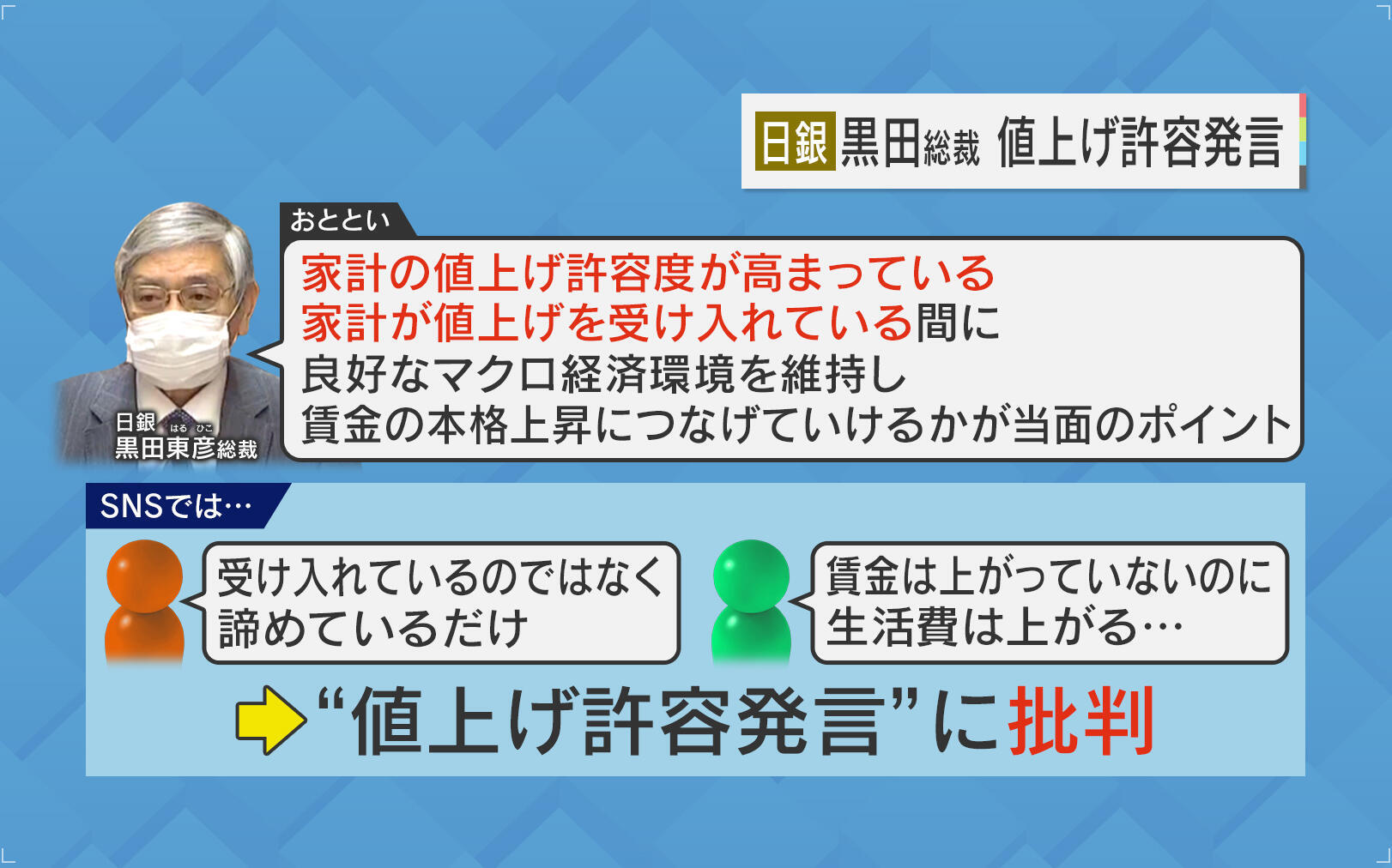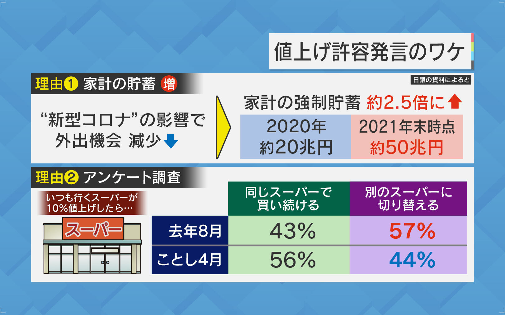 発言の理由として黒田総裁は、新型コロナの影響で外出の機会が減ったことによる家計の強制貯蓄が、2020年の20兆円に比べ2021年末には2.5倍の50兆円になったことや、渡辺努東大教授の行ったアンケート調査で「スーパーでいつも購入している商品の価格が10%上がったらどうするか?」との問いに、「同じスーパーで買い続ける」と答えた人の割合が、「別のスーパーに切り替える」と答えた人を上回ったことを上げています。