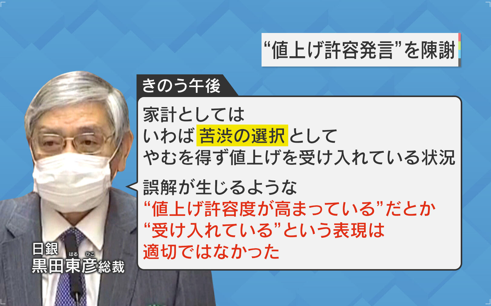 この批判を受け、6月7日午後、黒田総裁は異例の陳謝を行い「家計としてはいわば苦渋の選択として、やむを得ず値上げを受け入れている状況。誤解が生じるような『値上げ許容度が高まっている』だとか『受け入れている』という表現は適切でなかった」と謝罪しました。そして8日午後には「やはり物価上昇を上回るベースアップを含めた賃金上昇の実現が、何よりも重要であると考えています」とした上で「『家計が値上げを受け入れている』という表現は適切でなかった。誤解を招いた表現で申し訳ない」と重ねて陳謝しました。