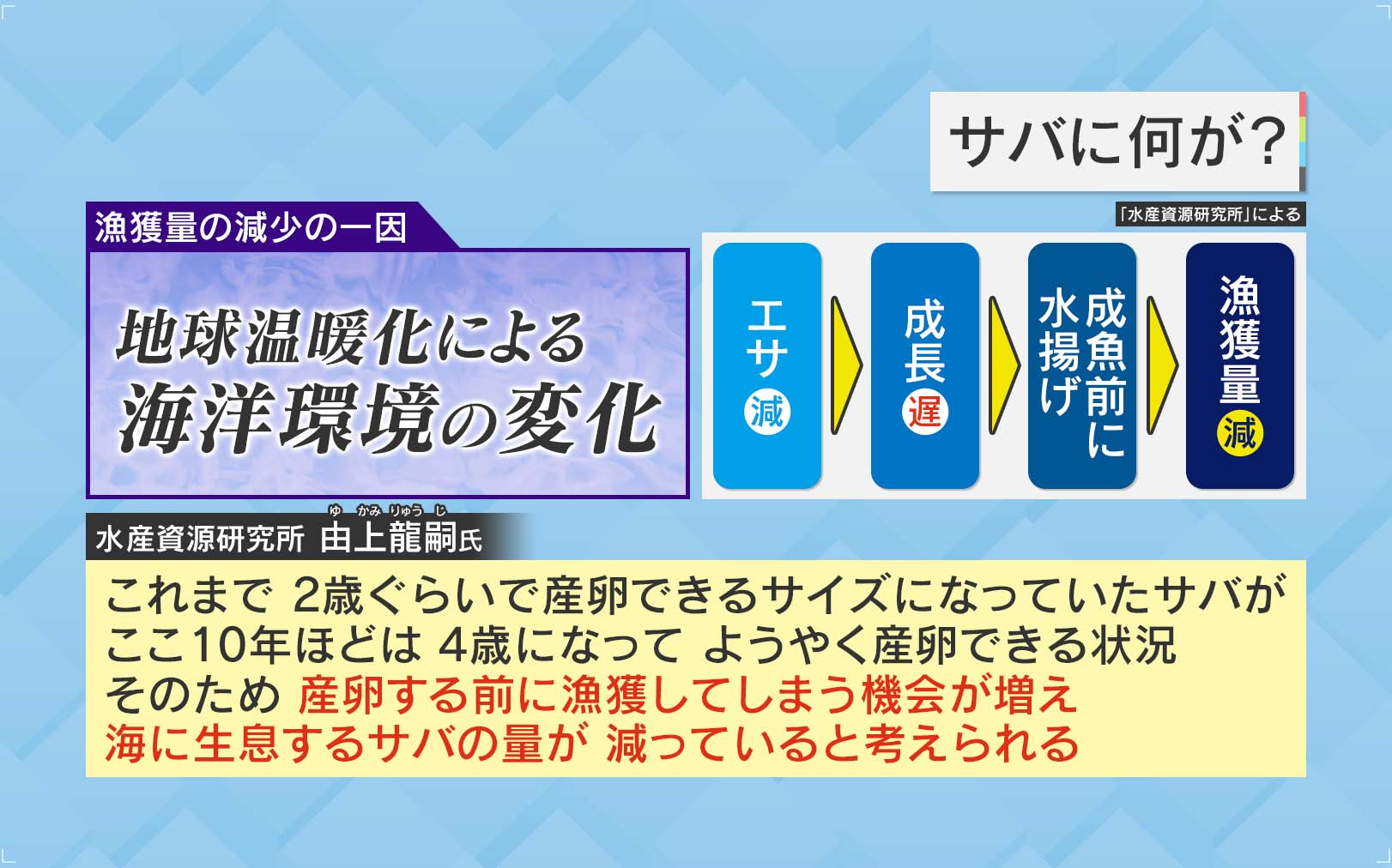 『水産資源研究所』由上龍嗣氏は、「これまで2歳ぐらいで産卵できるサイズになっていたサバが、ここ10年ほどは4歳になってようやく産卵できる状況。そのため、産卵する前に漁獲してしまう機会が増え、海に生息するサバの量が減っていると考えられる」と話しています。