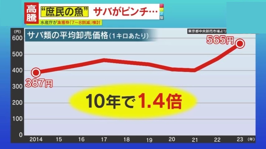 それに伴い、2014年に1キロ387円だった平均卸売価格が2023年は565円と、10年で1.4倍になりました。庶民の魚・サバが高嶺の花となり、食卓から姿を消してしまうのでしょうか…。