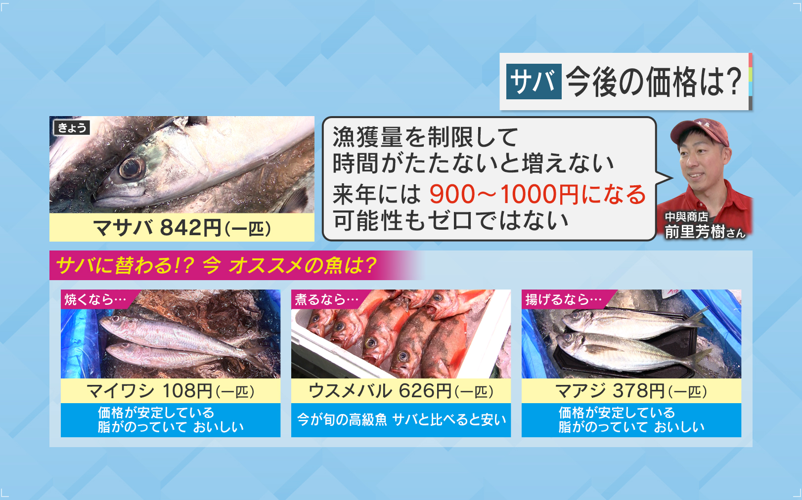 水産庁は2025年7月から、サバの漁獲枠を2024年より7~8割減らすことを検討しています。ただ、『中與商店』武蔵小山店・前里店長によると、「漁獲量を制限しても、時間が経たないと増えない。2026年には900~1000円になる可能性もゼロではない」ということです。そんな中で、オススメの魚を聞きました。