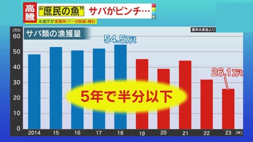 『農林水産省』によると、2018年には54.5万トンあったサバ類の漁獲量が、2023年は26.1万トンと半分以下に。