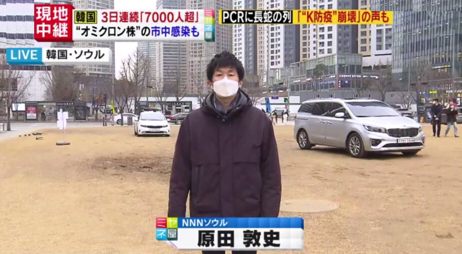 「こちらは、ソウル市内のヨンサンという場所で、日本人も多く住んでいるエリアです。こちらの駅前広場では、新型コロナの発生以降、PCR検査場ができ、今も稼働しているんですが、最近は検査数が非常に多く、ひっきりなしに検査する人が入っているという状況です。この広場が非常に広いのですが、時間帯によっては広場を囲むように人が並んでいて2時間以上待つケースもあるということです。現地の日本人からも不安の声が上がっています。」