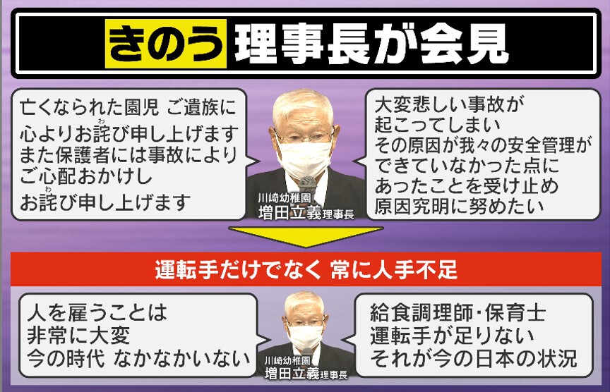 「はい、それは事実としてあります。今回、ドライバーが休みで理事長が代わりに運転したということですが、僕がアドバイザーで入っている保育園の中でも同じように園バスがある所があるのですが、ドライバーが欠席した際には、園長などがあらかじめ免許を取っておいて、代わりに運転するということも対応としてはあります。ただ、今回の人手不足とか先生たちへの負担が多いというのは、あくまで園側・業界側の勝手な都合や原因であって、それを理由にお子さんの命がなくなるということは、断じて許してはならないことですし、言い訳がましいという一言に尽きると思います」