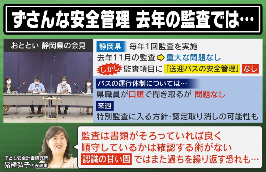 「ありえない対応だと思いますし、すごく疑問に思っているのが、普段とは違う対応が行われていたわけで、普通なら余計にチェックをするはずなんです。いつもと違うなら、より確認を行わなければならないのに、『いつもと違うから確認できませんでした』というのは、お子さんと関わる仕事をしている人間としては、失格としか言いようがないと思います」