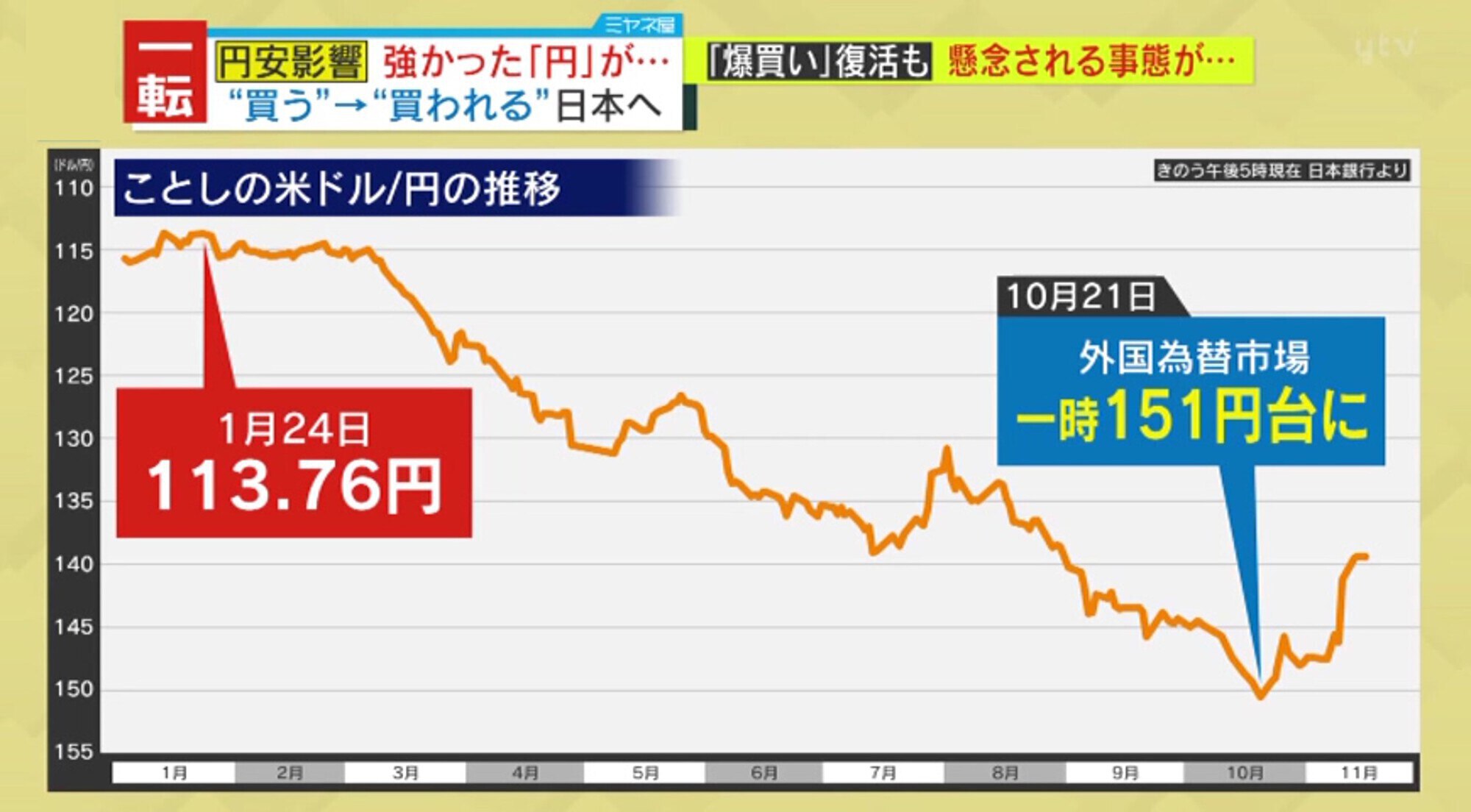 2022年に入り円安が急激に進み、10月21日には、一時1ドル151円台に突入しました。かつて「バブル景気」に沸いていた1989年には、アメリカ・ニューヨークの中心に建つ「ロックフェラーセンター」を買収するなど、世界の不動産を「買う立場」だった、強い“ジャパン・マネー”ですが、日本は今、円安により世界から「買われる立場」となっているのです。