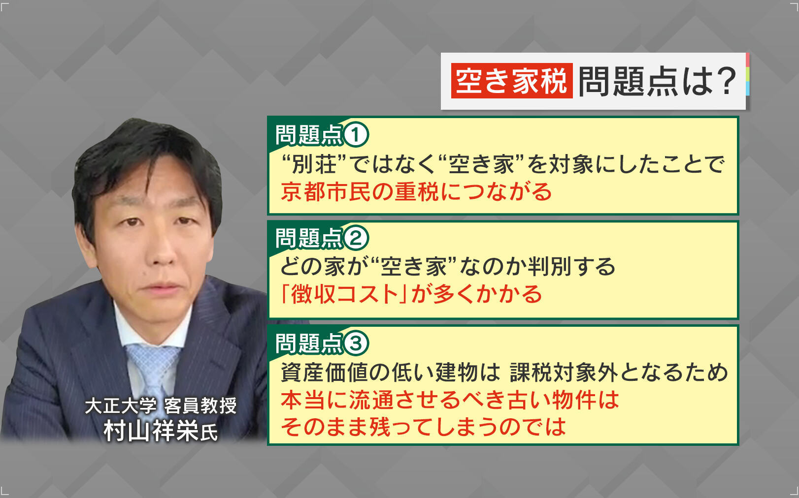 一方、大正大学客員教授の村山祥栄氏は、“空き家税”の問題点を3つ挙げています。「“別荘”ではなく“空き家”を対象にしたことで京都市民の重税に繋がる」「どの家が“空き家”なのか判別するのに『徴収コスト』が多くかかる」「資産価値の低い建物は、課税対象外となるため、本当に流通させるべき古い物件はそのまま残ってしまう恐れがある」としています。