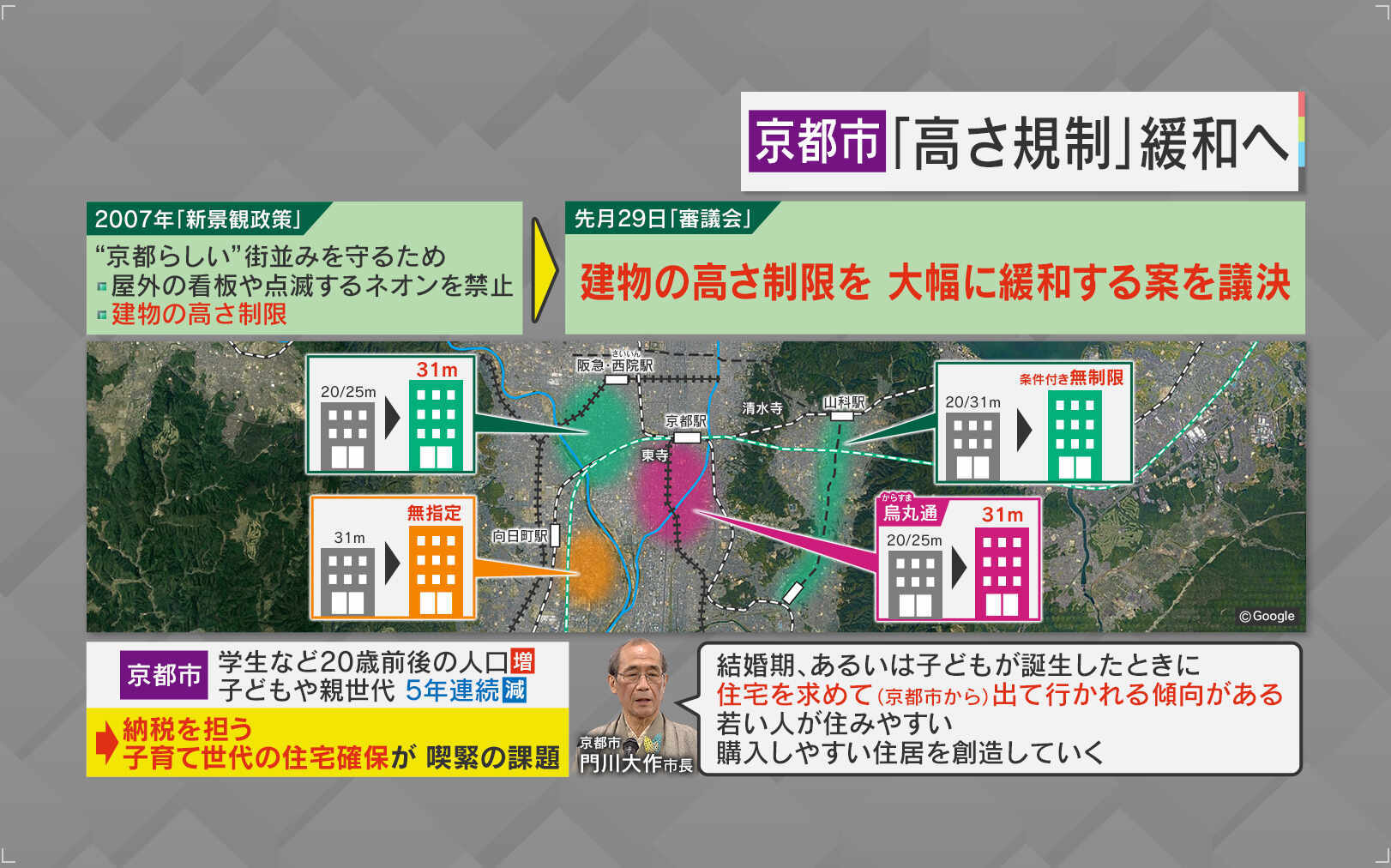 京都市の財政改善の対策のひとつが、「高さ規制」の緩和です。京都市では、2007年の「新景観政策」により“京都らしい”街並みを守るため、屋外の看板や点滅するネオンの禁止、建物の高さの制限などが設けられましたが、今年3月の「審議会」において、京都市内の西側や京都駅付近などで建物の高さ制限を大幅に緩和する案を議決しました。中でも市内東部の山科区の一部エリアでは、条件を満たせば高さ制限が完全撤廃され、タワーマンションが建つ可能性もあります。京都市の門川市長は、「結婚期、あるいは子どもが誕生した時に、住宅を求めて(京都市から)出ていかれる傾向がある。若い人が住みやすい、購入しやすい住居を創造していく」とコメントしています。
