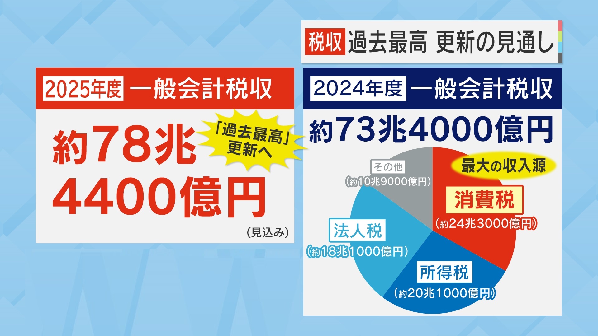 一方、2025年度の一般会計税収は約78兆円を上回る見込みで、過去最高を更新する見通しです。2024年度の一般会計税収(約73兆4000億円)の内訳は、『法人税』約18兆1000億円・『所得税』約20兆1000億円などを上回り、『消費税』が約24兆3000億円と最大の収入源となっています。