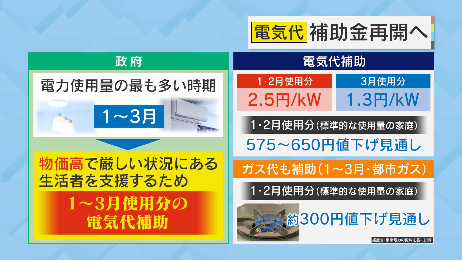 また、ガス代も補助されます(1~3月・都市ガス)。経産省・東京電力の資料を基にした試算によると、1・2月使用分(標準的な使用料の家庭)で約300円値下げの見通しです。