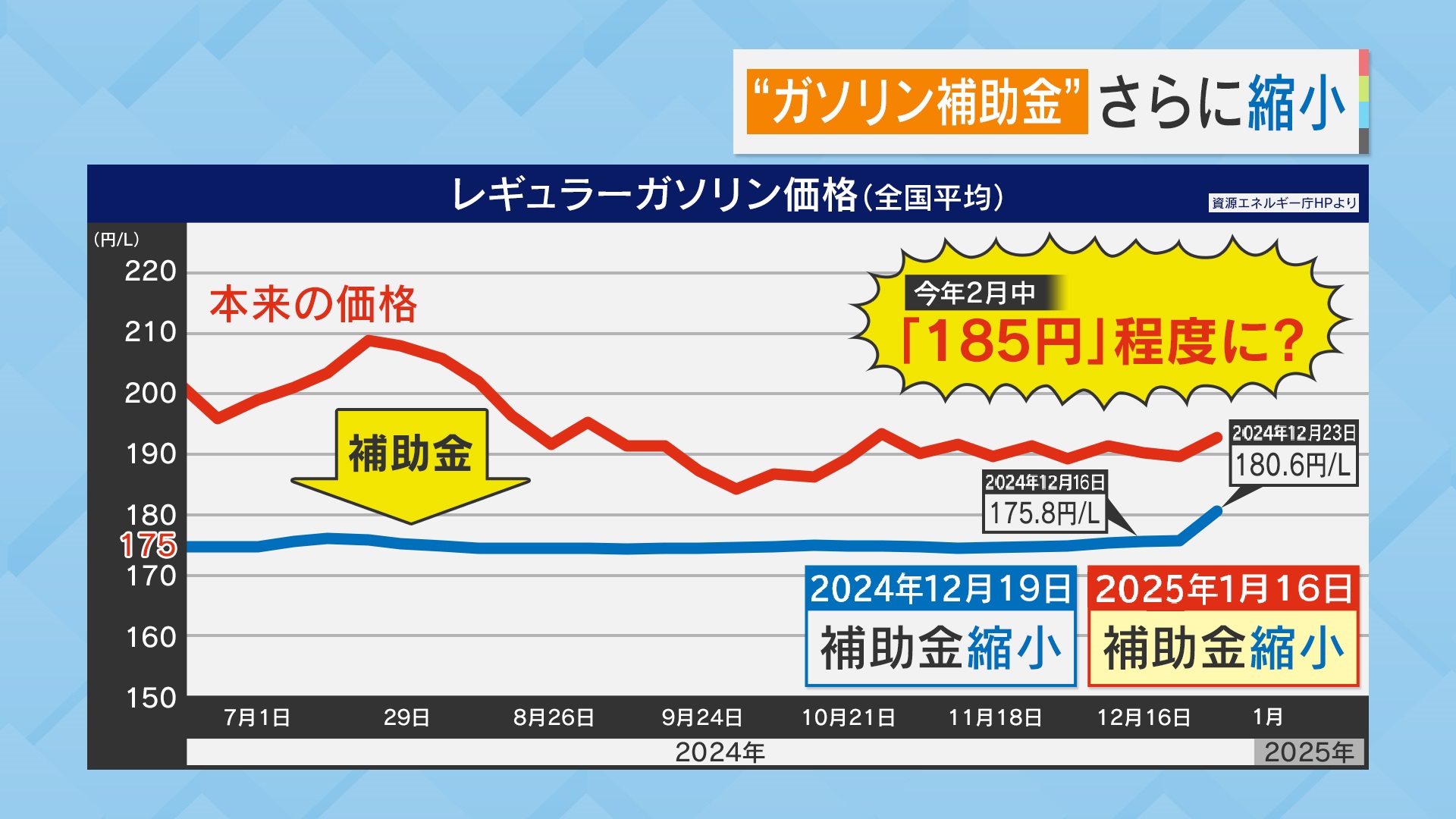 また、ガソリン代も上がります。ガソリンの“本来の価格”は原油価格によって変動しますが、2024年12月18日までは補助金が出ていたため、約175円/Lでした。しかし、同月19日に補助金が縮小され、同月23日時点で約180円/Lに。2025年1月16日には、さらに補助金が縮小されるため、同年2月には185円/Lになる恐れがあります。