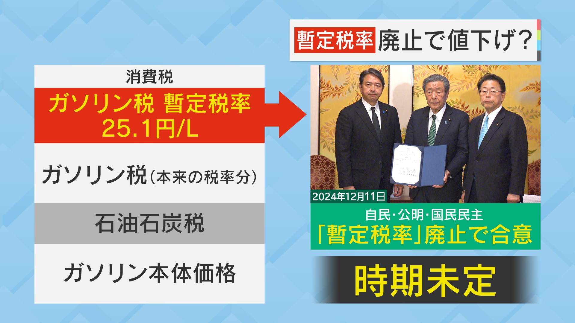 その中でも注目なのが、ガソリン税の暫定税率25.1円/Lです。「暫定」と言いながら昭和49年(1974年)から続いてきて、2024年12月11日に、ようやく自民・公明・国民民主が「暫定税率」廃止で合意しました。ただ、時期は未定だということです。