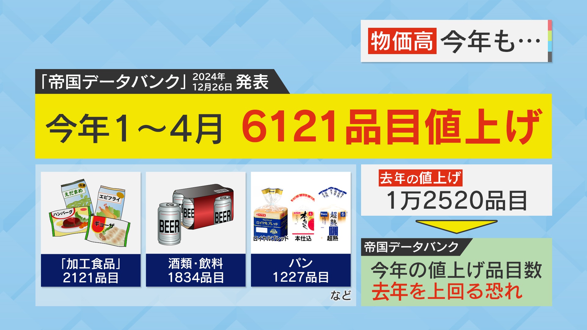 2024年12月26日、『帝国データバンク』は、「加工食品」2121品目・「酒類・飲料」1834品目・「パン」1227品目など、2025年1~4月に6121品目が値上げされると発表しました。2024年は1年間で1万2520品目が値上がりしましたが、2025年は4月まででその半分に及びます。『帝国データバンク』によると、2025年の値上げ品目数は2024年を上回る恐れがあるということです。