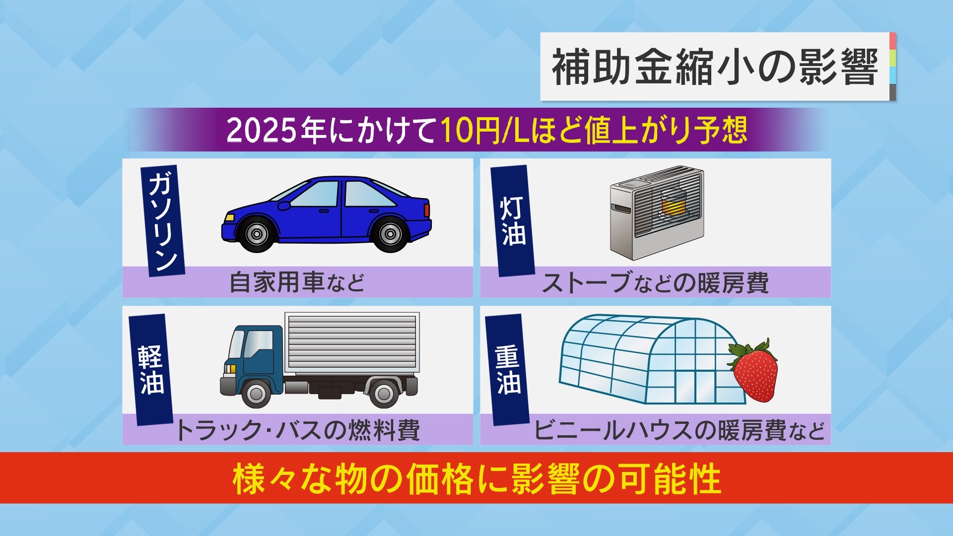補助金縮小は、様々な物の価格に影響する可能性があります。ガソリンは自家用車など、灯油はストーブなどの暖房費、軽油はトラック・バスの燃料費、重油はビニールハウスの暖房費などです。