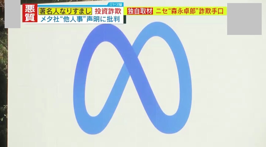 2024年1月~4月23日までのメタ社の“なりすまし広告”の数は、「ミヤネ屋」が調べただけでも、森永卓郎氏・約3700件、堀江貴文氏・約1600件、岸博幸氏・約1100件見つかりました。
