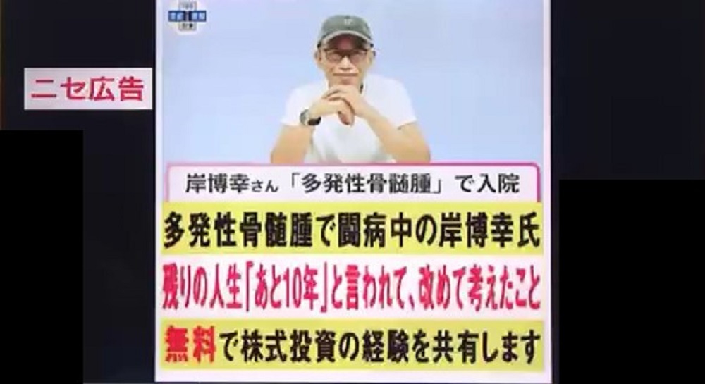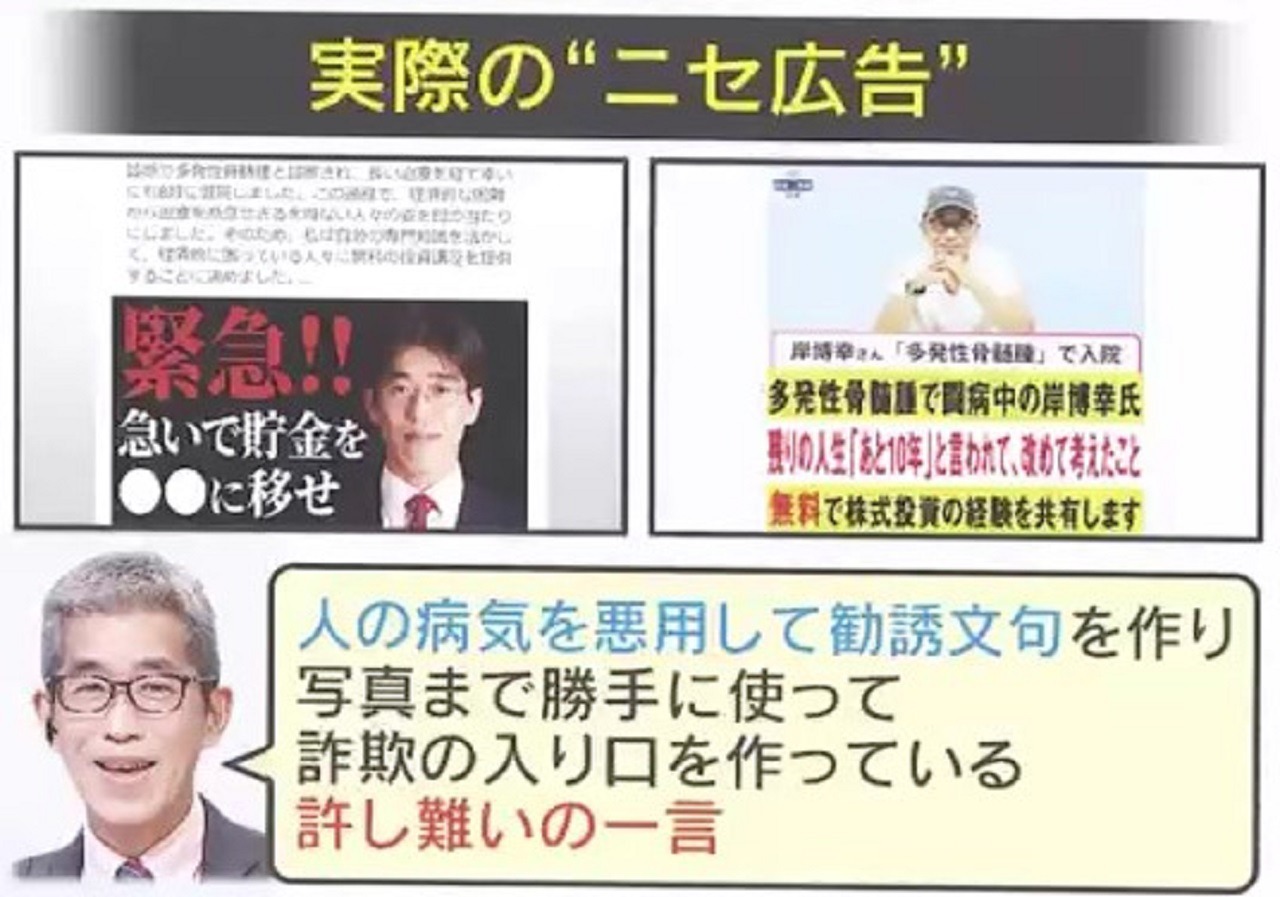 といった文言と共に、岸氏の写真が使用されていました。岸氏は、「人の病気を悪用して勧誘文句を作り、写真まで勝手に使って、詐欺の入り口を作っている。許し難いの一言」と話しています。
