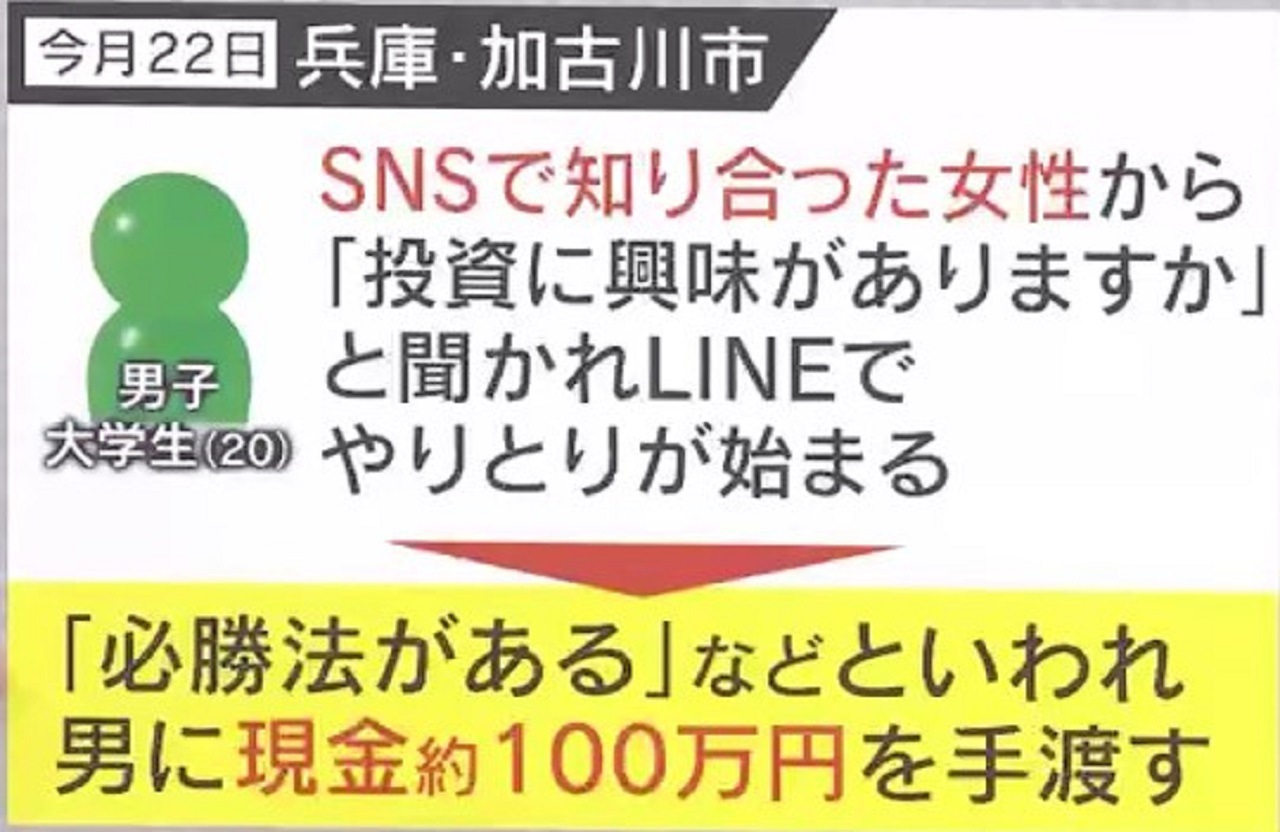 また、被害は幅広い世代に拡大しています。栃木・下野市の女性(60代)は、SNS上の広告表示から資産運用に興味を持ち、投資サイトにアカウントを作成。金取引のウソの投資話を信じ、計27回・総額1億2300万円以上を振り込みました。兵庫・加古川市の男子大学生(20)は、SNSで知り合った女性から「投資に興味がありますか」と聞かれ、LINEでやりとりが始まりました。「必勝法がある」などと言われ、別の男に現金約100万円を手渡しました。