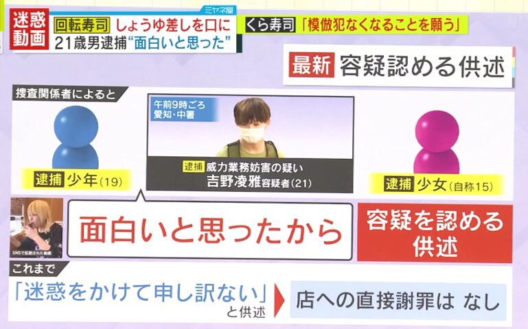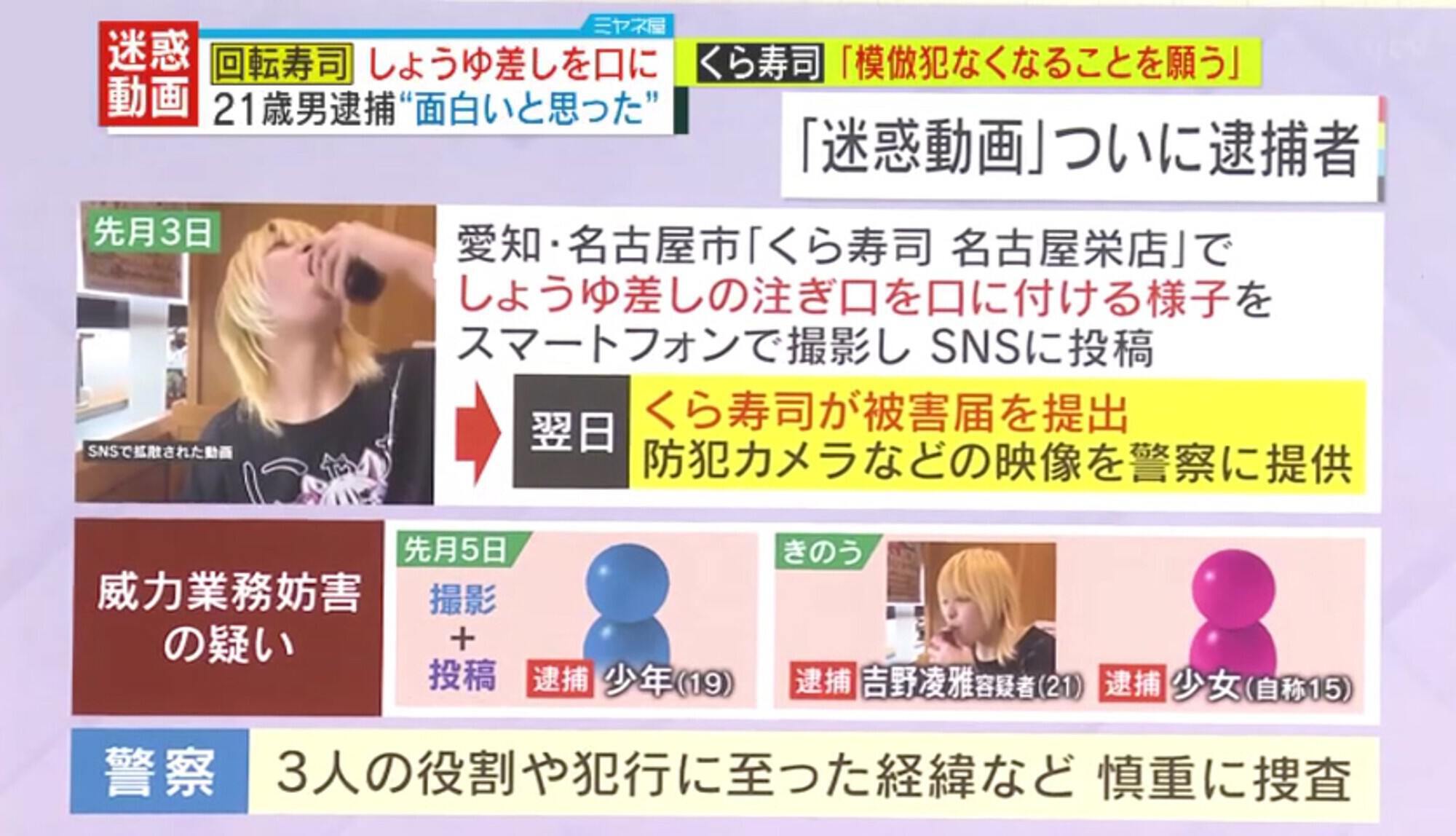 2月3日、愛知県名古屋市の「くら寿司 名古屋栄店」で、男がしょうゆ差しの注ぎ口を口に付ける様子を撮影した動画が、SNS上に投稿されました。事件発生翌日の2月4日、「くら寿司」は被害届を提出、防犯カメラの映像などを警察に提供していました。2月5日、この迷惑動画の撮影と投稿をした19歳の少年が「威力業務妨害の疑い」で逮捕されました。さらに3月8日、住居不定・無職の吉野凌雅容疑者(21)と、自称15歳の少女も同容疑で逮捕されました。警察は3人の役割、犯行に至った経緯などを慎重に捜査しています。