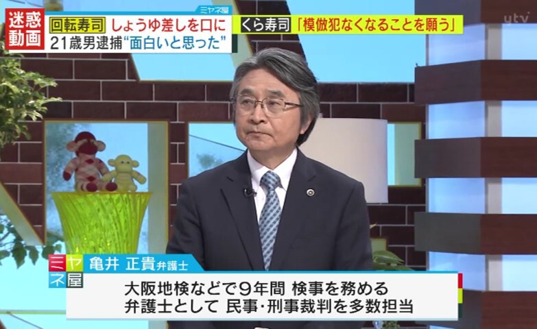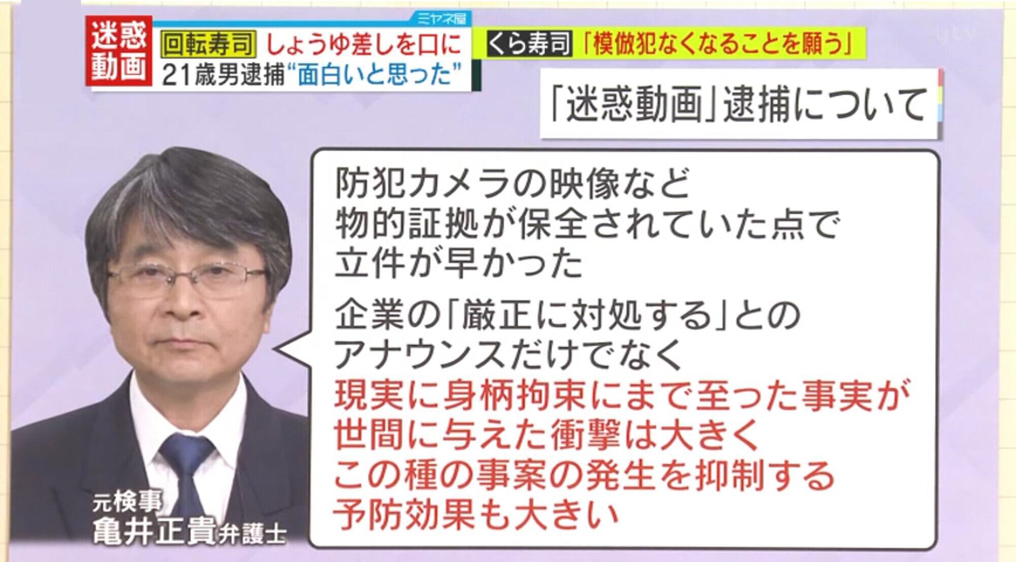 SNS上に相次いで投稿・拡散され、社会問題となっている“迷惑動画”で、ついに逮捕者が出ました。回転寿司チェーン「くら寿司」の店舗で、しょうゆ差しを口につける様子を撮影し、SNS上に投稿。店の業務を妨害したとして、21歳の男ら3人が逮捕されました。3人は「面白いと思ったから」という趣旨の供述をしているということです。この事件について、元大阪地検検事の亀井正貴弁護士が解説します。
