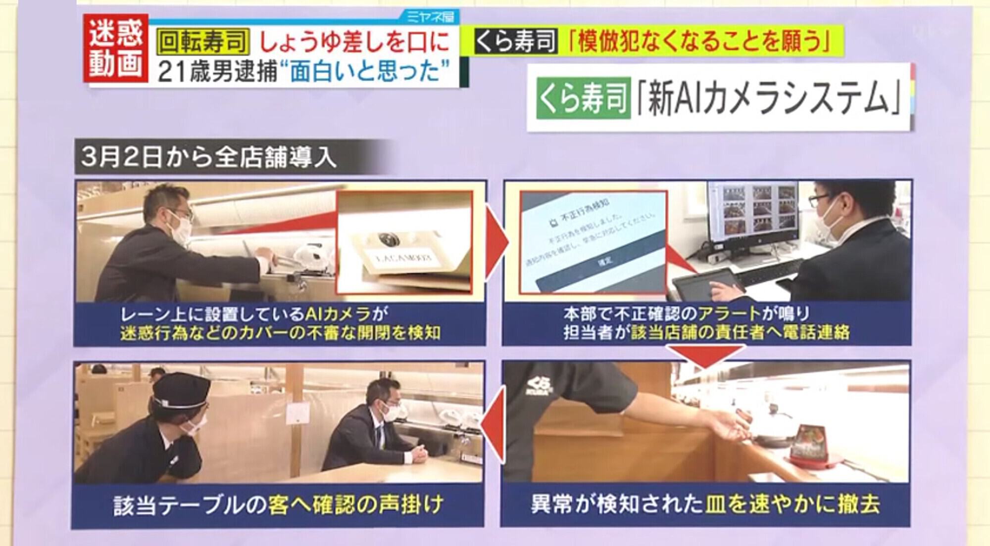 「くら寿司」では3月2日から、システム改修した「新AIカメラシステム」が全店舗に導入されています。レーン上に設置しているAIカメラが、迷惑行為などの不審なカバーの開閉を検知します。すると、本部で不正確認のアラートが鳴り、担当者が該当店舗の責任者への電話連絡を行います。異常が検知された皿を速やかに撤去し、該当テーブルの客へ確認の声かけを行うということです。