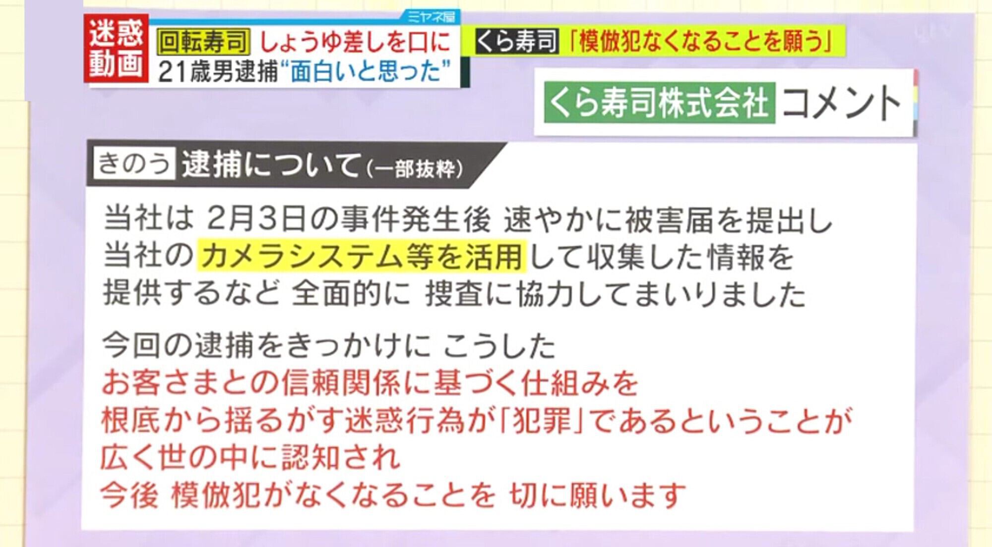 3月7日、くら寿司株式会社は、「当社は2月3日の事件発生後、速やかに被害届を提出し、当社のカメラシステム等を活用して収集した情報を提供するなど、全面的に捜査に協力してまいりました。今回の逮捕をきっかけに、こうしたお客さまとの信頼関係に基づく仕組みを根底から揺るがす迷惑行為が『犯罪』であるということが広く世の中に認知され、今後、模倣犯がなくなることを切に願います(一部抜粋)」とコメントを出しています。