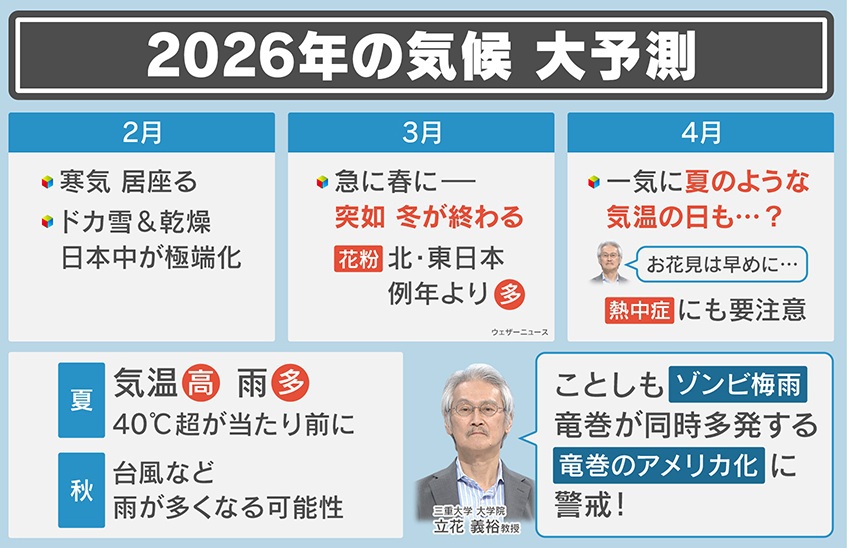 2026年の気候について、立花教授は「2月は寒気が居座り、ドカ雪と乾燥で日本中が極端化する」「3月は急に春が来て、突如、冬が終わる。花粉は北・東日本で例年より多くなる」「4月は一気に夏のような気温の日も…?お花見はお早めに。熱中症にも要注意」「夏は気温が高く雨が多い。40℃超が当たり前になる」「秋は台風など雨が多くなる可能性がある」と予測しています。