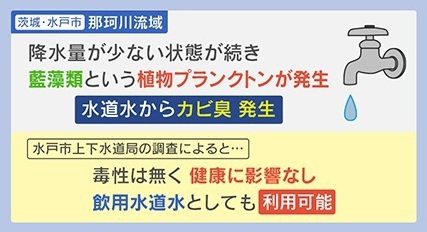 また、茨城・水戸市の那珂川流域では降水量が少ない状態が続き、藍藻類という植物プランクトンが発生。水道水からカビ臭が発生しています。水戸市上下水道局の調査によると、「毒性は無く健康に影響なし。飲用 水道水としても利用可能」ということです。