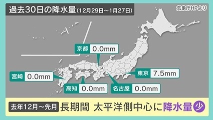 2025年12月~2026年1月にかけ、長期間、太平洋側を中心に降水量が少なくなっています。気象庁HPによると、過去30日(2025年12月19日~2026年1月27日)の降水量は東京が7.5mm、名古屋・高知・京都・宮崎は0.0mmでした。降水量が減ったことで各地のダムで貯水率が大幅に下がり、それぞれの自治体が節水を呼び掛ける事態となっています。