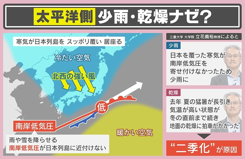 立花教授によると、日本を覆った寒気が南岸低気圧を寄せ付けなかったため、少雨になったということです。南岸低気圧は雨や雪を降らせますが、寒気が日本列島をスッポリ覆い居座っているため、近づけないといいます。