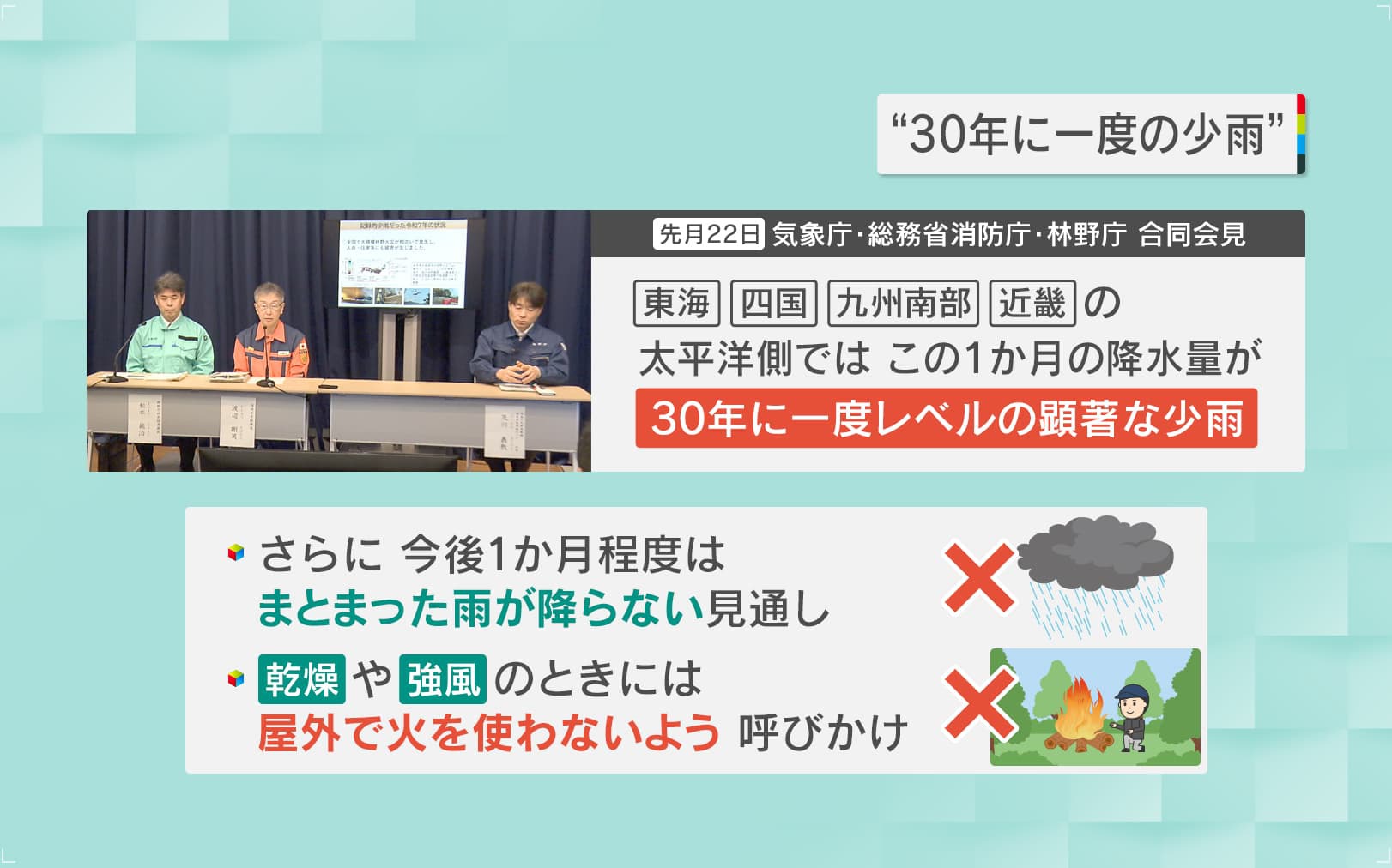 1月22日、気象庁・総務省消防庁・林野庁が合同会見を開き、「東海・四国・九州南部・近畿の太平洋側では、この1か月の降水量が30年に一度レベルの顕著な少雨」と発表しました。さらに今後1か月程度はまとまった雨が降らない見通しで、乾燥や強風のときには屋外で火を使わないよう呼びかけています。