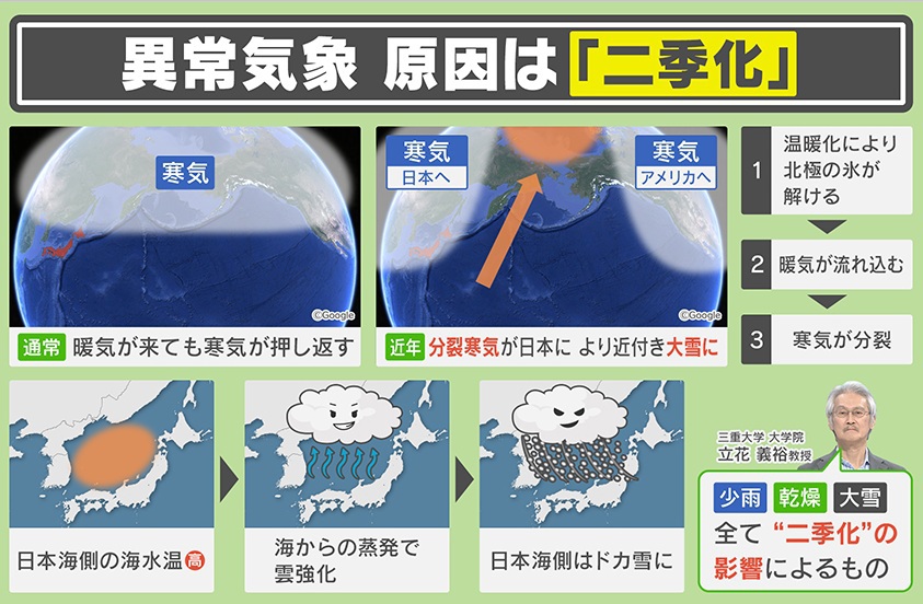 日本は今“30年に一度”の記録的な少雨に直面し、水不足により各地の自治体が節水を呼びかける事態となっています。一方で、日本海側を中心にドカ雪が続いています。この異常気象の原因は?夏と冬だけの“二季”という言葉を広めた三重大学大学院・立花義裕教授が、今後の日本の気候について詳しく解説します。