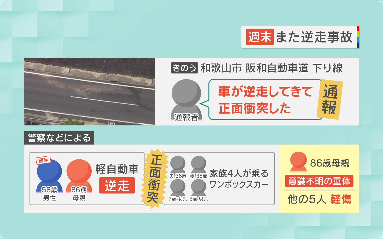 2025年8月10日、和歌山県の阪和自動車道で男性(58)が運転する軽自動車が逆走し、ワンボックスカーと正面衝突する事故が発生しました。ワンボックスカーに乗っていた5歳と7歳の子どもを含め6人がケガをして病院に搬送され、軽自動車に乗っていた女性(86)が意識不明の重体です(8月11日現在)。