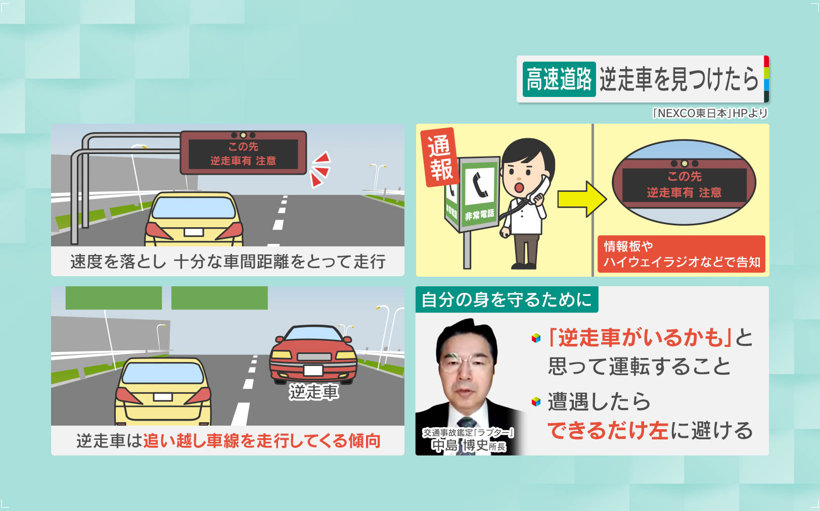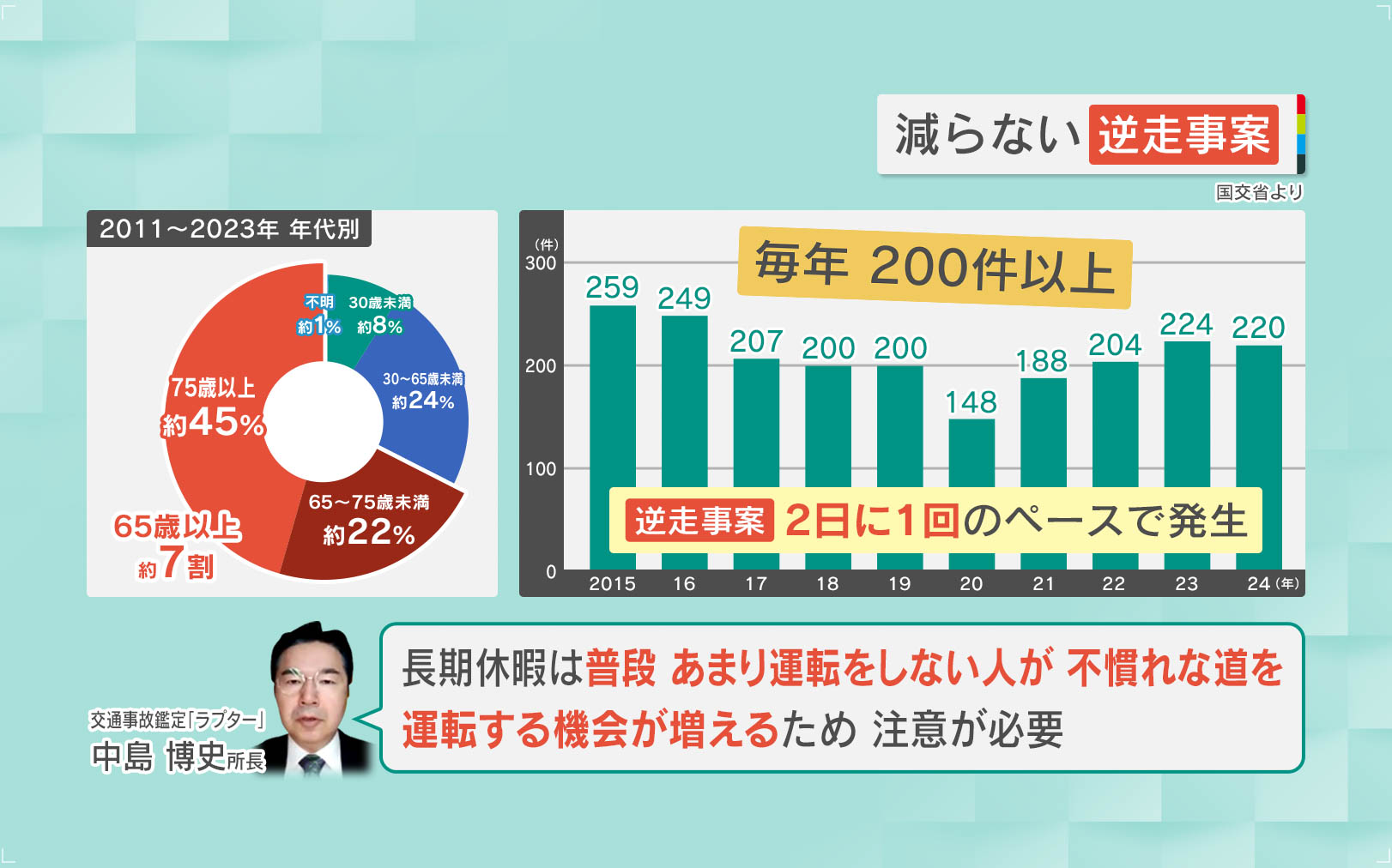 国交省によると、逆走事案は毎年200件以上、2日に1回のペースで発生しています。交通事故鑑定『ラプター』所長・中島博史氏は、「長期休暇は普段あまり運転をしない人が不慣れな道を運転する機会が増えるため、注意が必要」と警鐘を鳴らします。