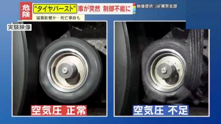 空気圧の不足による破裂の危険性を見る実験映像では、速度が上がると、空気圧が不足しているタイヤは破裂しました。日本自動車タイヤ協会が実施した調査によると、高速道路を走行している車の4台に1台が、空気圧が低い状態だという結果になりました。