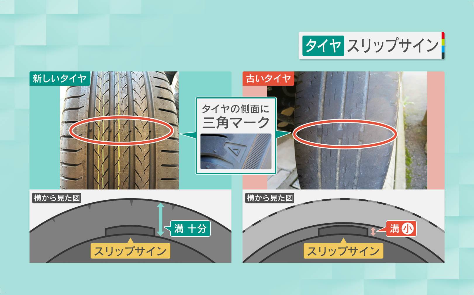 「基本的には、スリップサインが出ている状態は危険なので、交換しなくてはいけない状態です。スリップサインが出ていなくても、溝が浅い=雨を排水できない危険があるので、タイヤがすり減ってきたら交換するのが大事です」