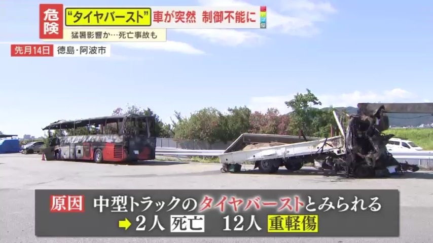 7月には徳島自動車道で、中型トラックと高速バスが正面衝突し、炎上する事故が発生しました。原因は中型トラックのタイヤバーストとみられ、2人が死亡・12人が重軽傷を負いました。