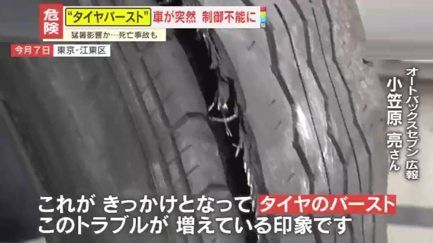 自動車整備・販売を行う『オートバックス』の担当者によると、「猛暑の影響で、路面の温度が非常に上がっている。これがきっかけで、タイヤがバーストするトラブルが増えている印象」ということです。タイヤは暑さに加え、昼と夜の寒暖差によってヒビが入りやすくなり、ヒビが入った状態で高温になると中の空気が膨張し、バーストに繋がる恐れがあるということです。