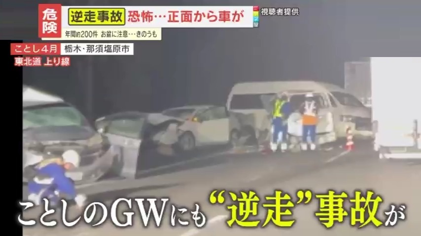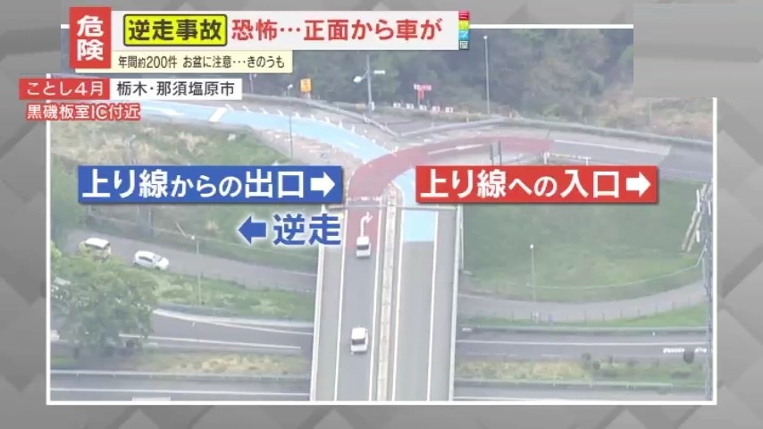 2024年のお盆には、栃木・那須塩原市の東北自動車道で軽自動車が逆走し、乗用車と正面衝突する事故が発生しました。この事故では双方の運転手が死亡し、乗用車に乗っていた子ども2人が頭にケガをしました。この付近では、2025年のゴールデンウィーク初日にも逆走事故が発生し、上り線を逆走していた車と別の車が正面衝突するなど、合わせて10台が絡む事故となり、3人が死亡・11人が重軽傷を負いました。